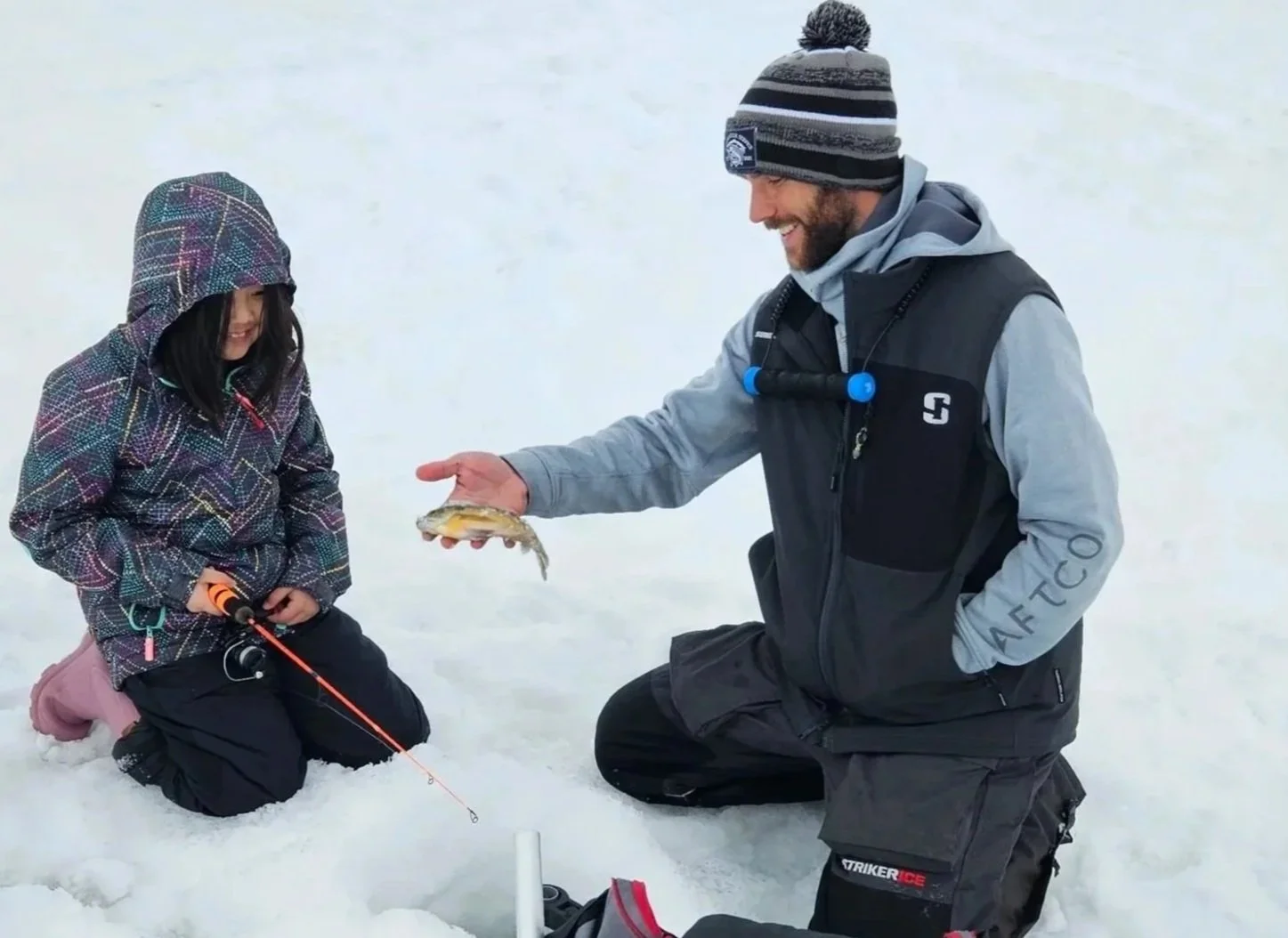 Captain Aaron’s top priority is ice safety. We always check or have someone check the ice prior to the trip. If there is any hint of weak or unsafe ice, the trip will be moved to another lake or canceled. A minimum of 4” for walking and 6” for snowmobiles is our requirement. Each lake freezes differently so just because one lake isn’t safe doesnt mean other isn’t as well. Alot of times if a lake is wind protected, it can have 10-20 inches of safe ice where as a lake that gets slammed with wind can even have open water.